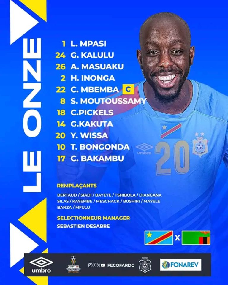 Sébastien Desabre a aligné un système de 4-3-3 pour affronter la Zambie. Lionel Mpasi devenu titulaire à la place Kiassambua est sans surprise dans les buts. Devant ses cages, le capitaine Chancel Mbemba et Henoc Inonga remplaçant de Bushiri sont dans l’axe, Arthur Masuaku et Gédéon Kalulu sur les côtés. Gaël Kakuta, Pickels et Samuel Moutoussamy sont le trio qui va animer le milieu de terrain. En attaque, le coach fait confiance à sa gâchette Cédric Bakambu qui sera entouré de Yoane Wissa et Théo Bongonda sur les ailes.